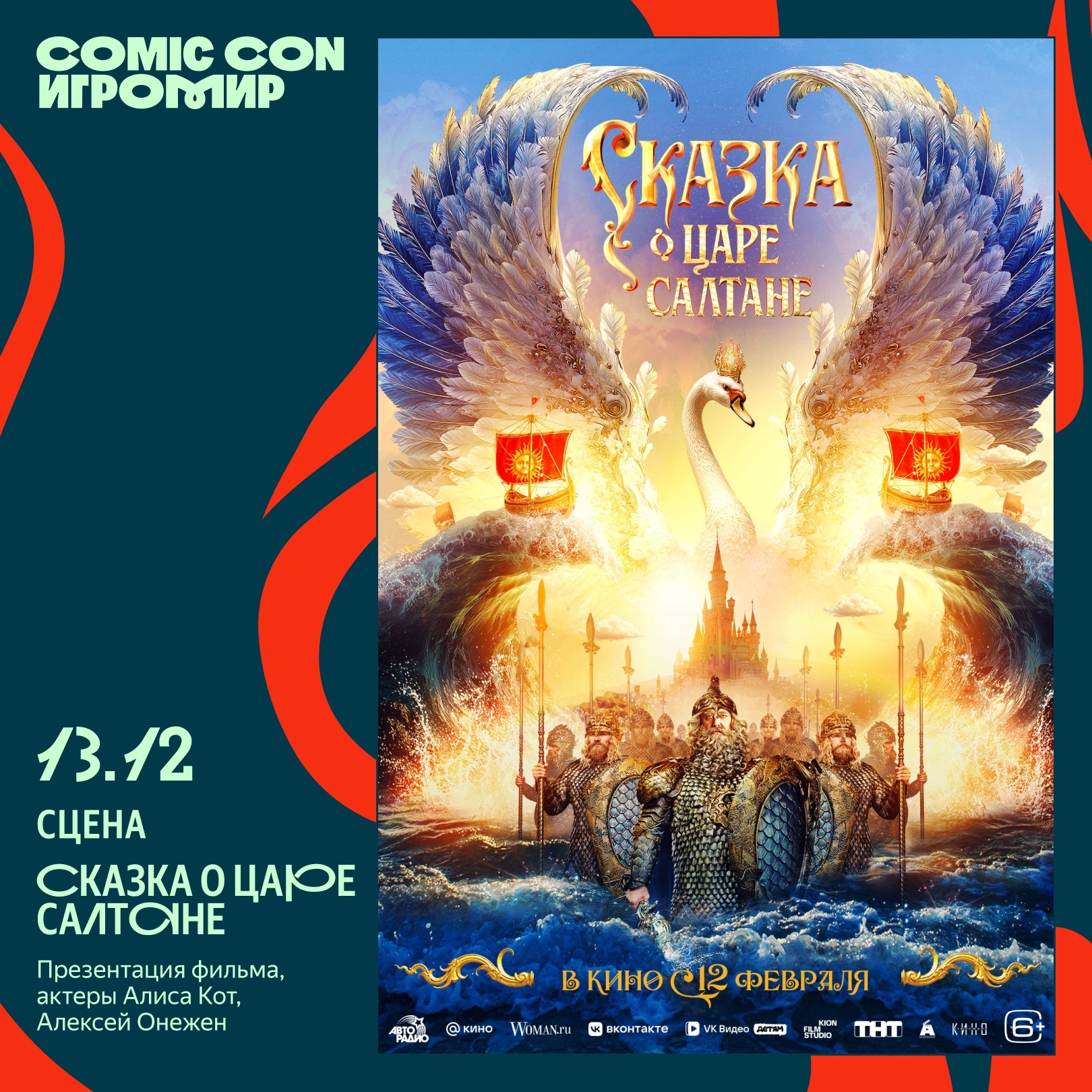12 февраля на экраны кинотеатров выйдет сказочное фэнтези по пушкинской классике, знакомой каждому из нас с младых ногтей! А за 2 месяца до релиза — 13 декабря — на фесте тебя ждёт презентация фильма «Сказка о царе Салтане».