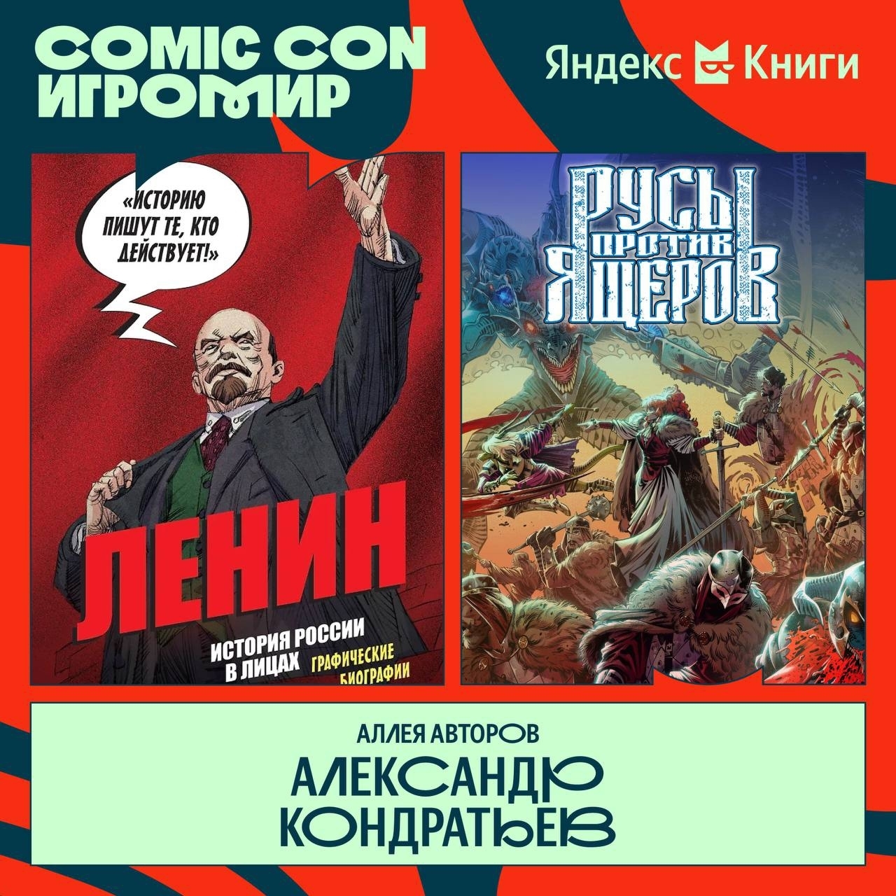 Александр Кондратьев — автор и сценарист, наиболее известный своими историческими работами. «История государства Российского в комиксах», «Ленин. Графическая биография», «Биографии поэтов Серебряного века в комиксах»… и серия комиксов про битвы русов против ящеров. И наоборот.